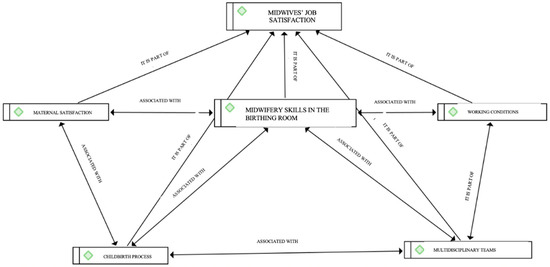 Figure 1 shows the interrelationship between categories. These include categories and subcategories relating to the factors influencing midwives’ job satisfaction, a definition of this concept, and the signs and symptoms observed in staff when they are dissatisfied. These themes are analysed below and include maternal satisfaction, midwifery skills in the birthing room, multidisciplinary teams, the childbirth process, and working conditions. The job satisfaction of midwives in midwifery is influenced by different dimensions. The dimensions as a whole and the interrelationship between them shape job satisfaction. The job satisfaction of midwives in midwifery is directly dependent on their working conditions. These working conditions are strongly influenced by professional development and job autonomy in the performance of the function. Respect for the competencies of the profession by the multidisciplinary team and teamwork have a decisive influence on the job satisfaction of midwives. Similarly, women’s satisfaction with the delivery process and obstetric outcomes shape midwives’ satisfaction with their work in the delivery room.