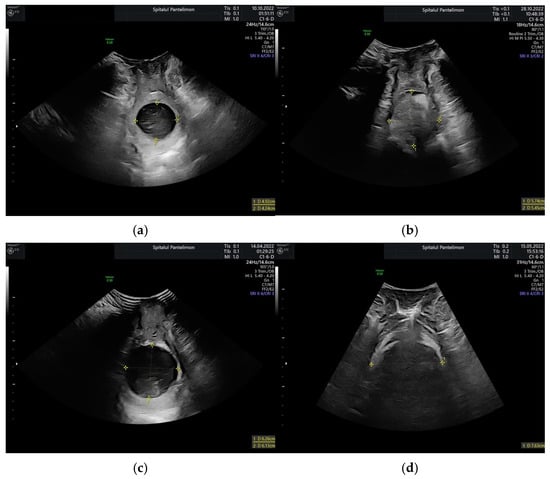 The ultrasound measurements were performed as presented in the Materials and Methods section, based on the descriptions of previous studies regarding the technique that is necessary to obtain cervical dilatation measurements through transperineal ultrasound in labor. Out of 478 measurements, 349 were performed on ruptured membranes (73.01%), and the rest were performed on intact membranes. The measurements performed on intact membranes were easier to perform due to the better visualization of the margins of the dilatation, and the placement of the calipers was better (as can be seen in Figure 1a,c. When performed on ruptured membranes, the margins of the cervical dilatation were seen with slightly more difficulty, with the examination taking more time (Figure 1b). Additionally, when the fetal head was engaged and descended, the examinations became more difficult, with a lower visualization score (Figure 1d). For each evaluation, we measured the anteroposterior and transverse diameters of the dilatations, as shown in Figure 1. The mean of the two diameters was calculated after the examination. All measurements were analyzed and compared with the mean diameter of the clinical dilatation. From each dilatation range or level, we considered the mean of the interval as the value of the clinical dilatation, eg., for 3–4 cm clinical dilatation, we considered 35 mm the clinical dilatation value with which we performed the statistical analysis.