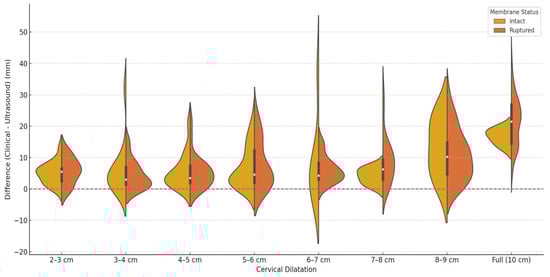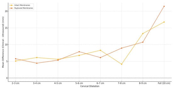 The analysis of the difference between clinical dilatation evaluation and mean diameter of the dilatation calculated by ultrasound measurements and stratified by clinical dilatation range and membranes status can be seen in the violin plot presented in Figure 2. This analysis reveals that ultrasound tends to underestimate dilatation more in cases with ruptured membranes, especially as dilatation progresses. The same trend was observed when we performed a sub-analysis on the transverse and anteroposterior diameters compared with the mean clinical dilatation diameter. In Figure 3, we analyze the mean difference trend between clinical dilatation evaluation and mean diameter of the dilatation calculated by ultrasound measurement, stratified by clinically estimated cervical dilatation range and membrane integrity. A consistent underestimation is noted for ruptured membranes, with the largest discrepancy at full dilatation. The intact membrane group showed smaller differences.
