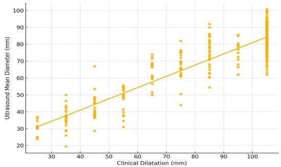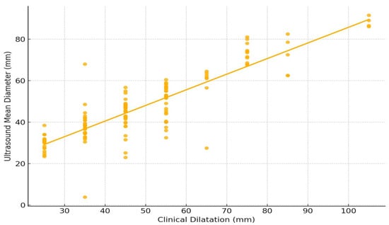 - Regression equation: Ultrasound Mean Diameter ≈ 14.41 + 0.67 × Clinical Dilatation.