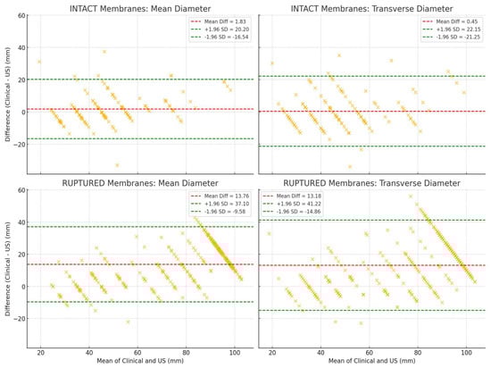 Bland-Altman plot analysis comparing clinical dilatation evaluation and mean ultrasound diameter of the dilatation calculated after ultrasound measurements and transverse diameter, divided by membrane status (the red dashed line shows the mean difference; the green dashed lines represent the limits of agreement—mean ± 1.96 × SD).
