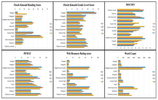 The ChatGPT-4o, DeepSeek, and Gemini2 Flash occupied an intermediate performance tier. ChatGPT-4o displayed modest reliability (mean DISCERN = 57.19), with average PEMAT-P and WRR scores of 51.75 and 6.27, respectively. DeepSeek and Gemini2 Flash showed comparable trends, with balanced but unremarkable performance across domains. Although some of these models generated more readable content, they were often deficient in terms of structural clarity, depth, or action-oriented guidance (