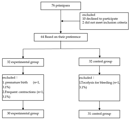 From 23 June 2022 to 20 June 2023, a total of 76 primiparous women were contacted, and 64 were willing to participate. They were divided into experimental groups and control groups according to the mothers’ wishes. During this study, one participant in the experimental group had a premature delivery due to early water rupture, and the other one was hospitalized for tocolysis due to frequent uterine contractions and therefore withdrew from the experiment, resulting in the loss of two samples. For the control group, one participant was admitted to the hospital for tocolysis due to prepartum hemorrhage and was withdrawn from this study. Therefore, a total of 61 participants completed this study (30 in the experimental group and 31 in the control group) (Figure 1).