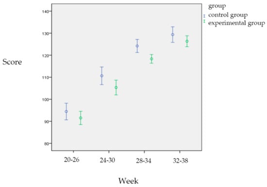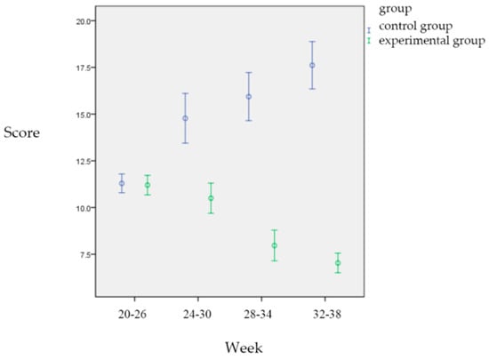 Figure 3 shows that as the number of weeks of pregnancy increased, the stress in the control group gradually increases, while there was no significant difference in the experimental group. After 12 weeks of yoga, although the experimental group had 2.918 points less discomfort during pregnancy than the control group, this did not reach a statistically significant difference (p = 0.210). As the number of weeks of pregnancy increased, the stress of pregnancy tended to gradually increased (p < 0.001). However, the results of cross-comparison between elapsed time and group showed that the experimental group’s stress at 32 to 38 weeks was 0.103 points less than that at 20 to 26 weeks of pregnancy (p = 0.970), which means that the stress of the experimental group was compared with the control group. There was no significant difference between the two groups. The stress of both groups showed a gradual increase with the increase in pregnancy weeks. However, the results of cross-comparison between time and group showed that the experimental group’s stress at 32 to 38 weeks was 0.103 points less than that at 20 to 26 weeks of pregnancy (p = 0.970), indicating that the stress of the experimental group was not significantly different from that of the control group. The stress of both groups showed a tendency to gradually increase with the increase in pregnancy weeks (Figure 3, Table 6).