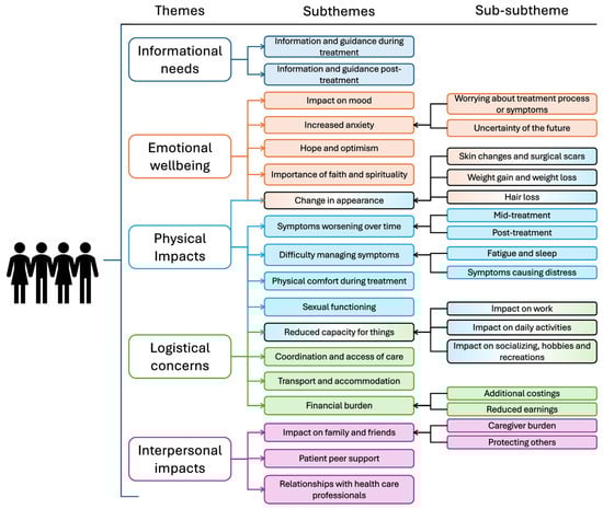 Five themes were identified in the analysis (Figure 1): informational needs, emotional wellbeing, physical impacts, logistical concerns, and interpersonal impacts. Supporting quotes illustrate key themes, with additional quotes presented in the Supplementary Materials (Table S1).