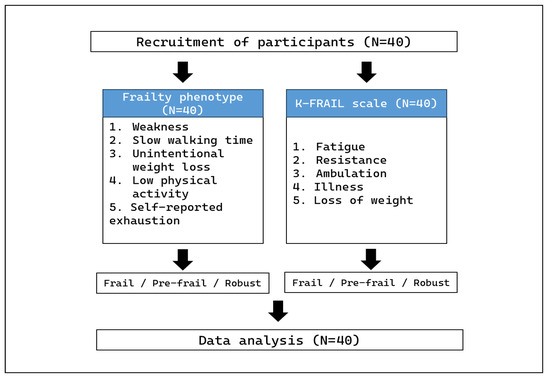 Experimental procedure for participants. Forty participants completed both the frailty phenotype and the K-FRAIL scale without dropouts (N = 40).