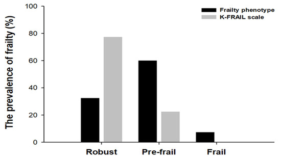 The prevalence of frailty in the frailty phenotype and the K-FRAIL scale. The status of frailty using the frailty phenotype (weakness, walking time, weight loss, physical activity, and exhaustion) and the K-FRAIL scale (fatigue, resistance, ambulation, illness, and weight loss) were determined by scores of each criterion. The numbers in each bar graph represent the percentage associated with frailty phenotype (black) and K-FRAIL scale (grey) for robust, pre-frail, and frail.