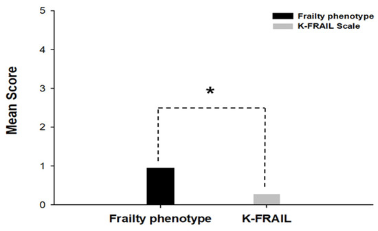 Mean scores using the frailty phenotype and the K-FRAIL scale assessment tools. The mean scores of frailty phenotype and K-FRAIL were evaluated by sum of each criterion in two assessment tools. The frailty phenotype was shown in black. The K-FRAIL was represented in grey. The mean score was increased in frailty phenotype (0.95) than in K-FRAIL scale (0.28). * indicates p < 0.05.