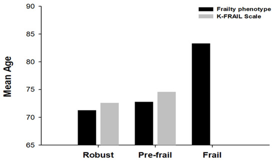 Mean age according to frailty status (robust, pre-frail, and frail). In the robust and pre-frail category, the mean age determined using the K-FRAIL scale was higher than that determined using the frailty phenotype.