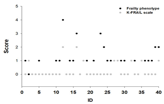 We recruited 40 older adults aged 65 years or older to compare the frailty phenotype and the K-FRAIL scale. All participants were of Korean nationality and completed this study without dropouts (Figure 1). Among the 40 individuals, 27 were male and 13 were female; mean participant age was 73.1 ± 5.8 years. The mean systolic blood pressure was 146.7 ± 14.9 mmHg, and the mean diastolic blood pressure was 78.1 ± 10.9 mmHg. The mean height and body weight were 167.7 ± 8.9 cm and 63.8 ± 10.3 kg, respectively, and the mean BMI was 24.3 ± 3.0 kg/m2. The mean grip strength and walking speed of the participants were 33.44 ± 7.72 kg and 3.32 ± 0.83 s, respectively. Unintentional weight loss was −0.17 ± 2.21 kg, while physical activity and self-reported exhaustion were 1969.93 ± 1530.28 kcal and 0.40 ± 0.74 day, respectively (Table 3).