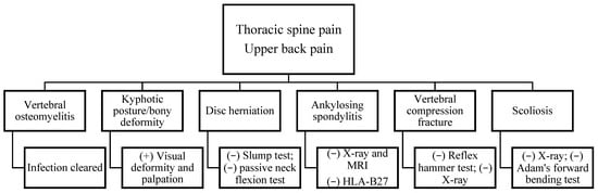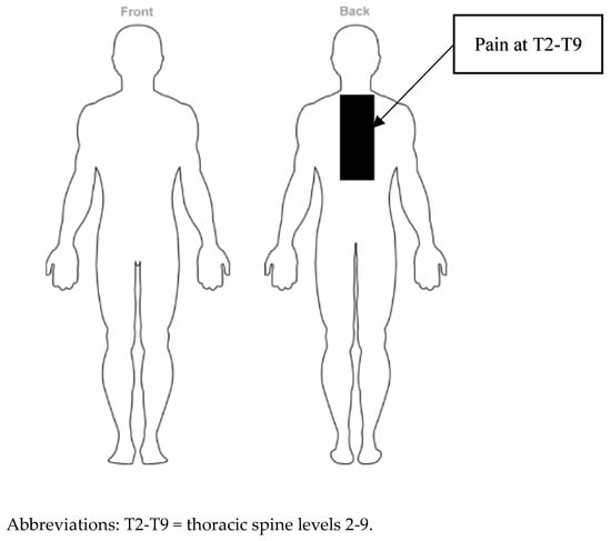 Prior to the examination, informed consent was obtained, and the patient’s rights were protected. On examination, the patient reported consistent upper back pain for 4 months that had occurred after developing, being diagnosed, and treated for osteomyelitis of the thoracic spine at levels T7–T9. There were no complaints of extremity pain or radicular symptoms in the upper or lower extremities (Figure 1, Table 2). The pain pattern she was experiencing included many potential pain sources, drawing attention to specific differential diagnoses (Figure 2). The patient’s pain intensity score was 8/10 (NPRS, 0–10), the disability score was 46/50 (NDI), 0–50), and the functional scale score was 3/30 PSFS, (0–10) [,,,]. The patient was hoping to return to work as a high school teacher without pain.