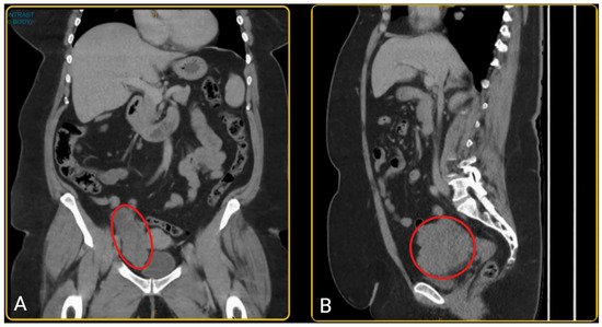 (A) The coronal view of the pelvic CT scan; (B) the sagittal view of the pelvic CT scan showing a mass in the right lower quadrant of the abdomen, anteromedial to the iliac vessels and posterior to the bladder, consistent with a right adnexal mass (outlined in red). The mass measures 103 × 98 × 50 mm, with a well-demarcated, irregular border and has a heterogenous composition with varying internal density.