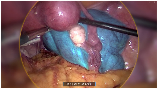 Intraoperative image showing overall view of pelvic mass in blue overlay. The mass was attached to the uterus laterally, anteriorly extending up to the paravesical space, laterally to the external iliac vessels, and posteriorly in the pararectal space.
