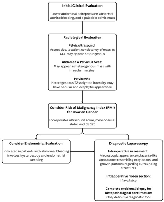 Pre-operative diagnostic techniques for CDL often yield an inconclusive or incorrect diagnosis. The diagnostic work-up for CDL is summarised in Figure 4 and begins with clinical evaluation and screening for signs and symptoms similar to those of typical leiomyomas, including lower abdominal pain/pressure, abnormal uterine bleeding, and a palpable pelvic mass. Radiological evaluation can include pelvic ultrasound and CT as well as MRI, where CDL often presents as heterogenous mass, raising concerns of malignancies such as leiomyosarcomas. However, to date, these imaging modalities cannot clearly differentiate malignant differentials from CDL [39]. An incisional core biopsy can be valuable for pre-operative diagnosis but is limited by sampling errors and insufficient information, where the biopsy may not capture the representative tissue, especially in heterogeneous tumours. Additionally, the risk of tumour seeding discourages the use of incisional core biopsies in situations where the diagnosis has not been confirmed [40]. In our case, since the pre-operative diagnosis was not established, an incisional core biopsy was not applicable.
