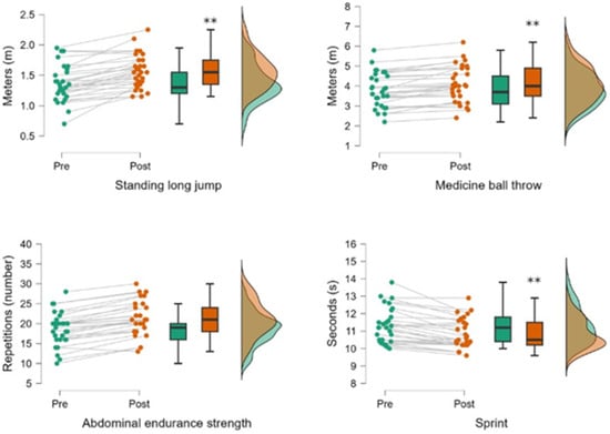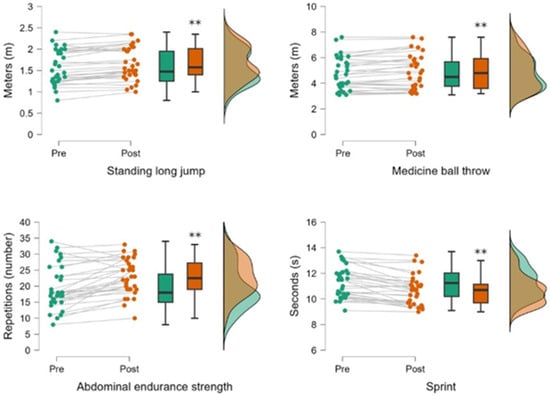 In Figure 2, we can observe the differences obtained in the G2exp (ages 15–16) between the pre- and post-intervention measurements. The differences were statistically significant in the standing long jump, medicine ball throw, abdominal endurance strength, and sprint. p denotes significance index (*: p ≤ 0.05; **: p ≤ 0.01).