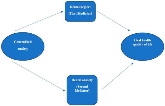 Generalized anxiety could have an indirect effect on dental anxiety and dental neglect, which ultimately might affect OHRQoL. Therefore, higher generalized anxiety could lead to a higher level of dental anxiety and thus being more prone to dental neglect. Dental neglect behavior could lead to poorer OHRQoL. Like many other countries, many patients suffer from dental anxiety in Jordan and Saudi Arabia [30,31,32]. Since dental anxiety influences various health aspects based on factors like personal experiences and cultural background, there is a necessity to understand the complex interaction of dental anxiety in these regions where dental anxiety is highly prevalent. There is no research on the mediating effect of dental anxiety and dental neglect on the association between generalized anxiety and OHRQoL. Therefore, this research aims to study the complex interplay between dental anxiety, generalized anxiety, dental neglect, and OHRQoL in the general public. This study hypothesizes that dental anxiety and dental neglect mediate the relationship between generalized anxiety and OHRQoL.