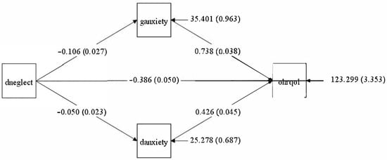 SEM output of the association between general anxiety and Oral Health-related Quality of Life mediated by dental anxiety and dental neglect.