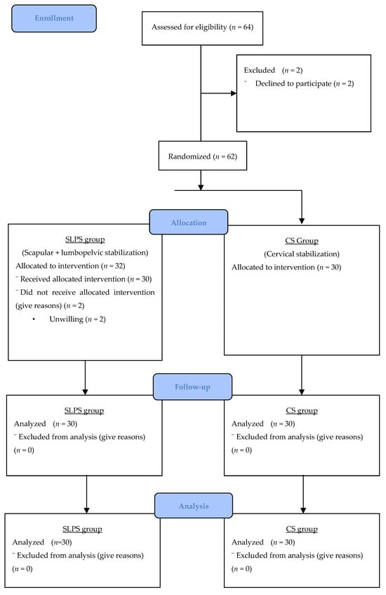 Participants were randomly assigned by the principle investigator, who also performed the assessment and treatment, to one of two groups using the coin flip method: the SLPS group (n = 30) and the CS group (n = 30). The participant flowchart is shown in Figure 1 []. Participants were informed about the study before enrollment and signed written informed consent forms. Finally, 64 participants meeting the inclusion criteria were included in the study.