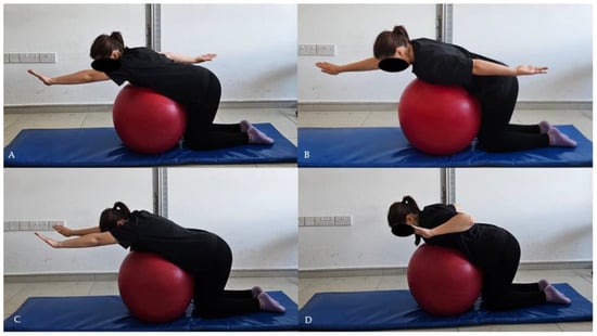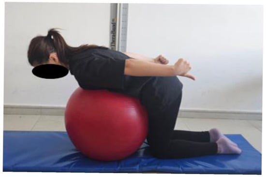 The participants were positioned kneeling with their knees flexed at 90° with a Pilates ball placed between the chest and the abdomen. From the side, the earlobe, scapula, acromion, and pelvis were aligned in a straight line. The participants were asked to perform the first three exercises below in this position. Two sets of 15 repetitions were performed, with each movement held for 10 s. The exercise intensity was increased after 4 weeks by adding weight with dumbbells.