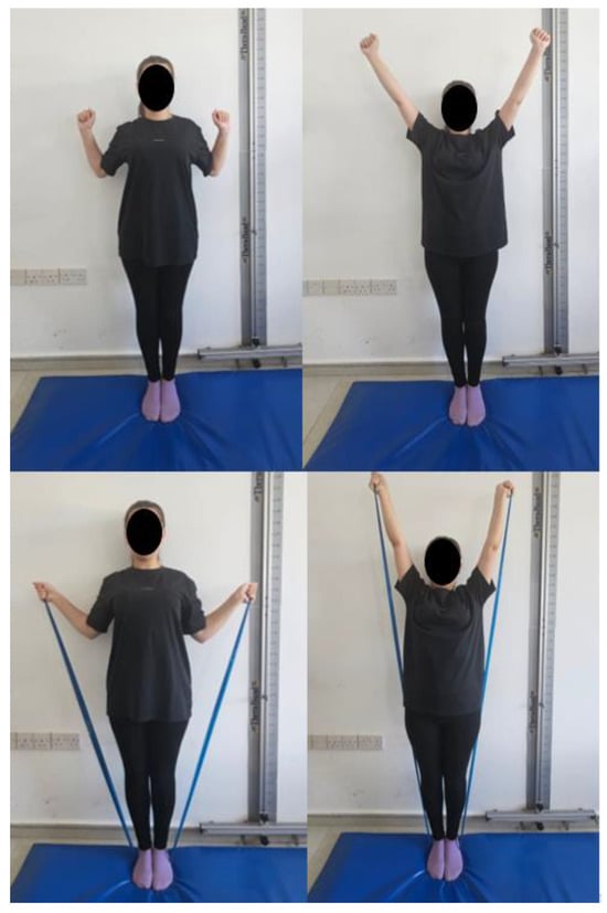 Scapular upward rotation exercises: The participants were asked to stand with their back against a wall, maintaining contact from the head to the buttocks, and feet positioned shoulder-width apart. In the starting position, the elbows were flexed at 90° and the shoulders were abducted to 90° with external rotation. The participants were instructed to slide their arms upward along the wall until reaching 180° of shoulder abduction. The participants were then instructed to maintain the arm position for 3 s. The exercise was conducted in three sets of 10–15 repetitions. These exercises were performed using an elastic exercise band (three sets of 10 repetitions) (Figure 4).