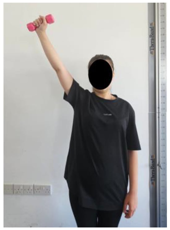 Arm raises for the lower trapezius muscle fibers: The participants were asked to perform shoulder abduction in the scapular plane above 120° while standing (three sets of 10–15 repetitions). The exercise progressed by adding weight with dumbbells (three sets of 10 repetitions) (Figure 5). Moseley et al. identified shoulder abduction between 90° and 150° as the optimal exercise to activate the lower trapezius muscle (68% maximum voluntary isometric contraction). However, Ekstrom et al. discovered that shoulder abduction above 120° in the plane of the scapula led to 61% maximum voluntary isometric contraction EMG (electromyography) activity and was considered the best exercise. Shoulder abduction above 120° in the plane of the scapula is also an excellent exercise for coactivating the trapezius and serratus anterior muscles [,].