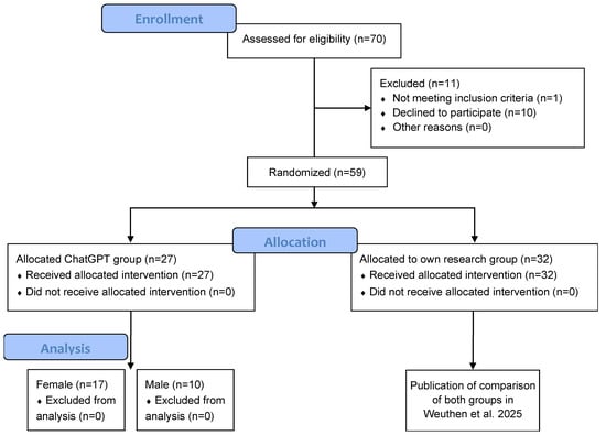 In the superordinate study, 70 participants were assessed for eligibility (Figure 1); 10 were excluded due to the discontinuation of the online study, and one was excluded for not indicating their medical background (thus, not meeting the inclusion criteria). The remaining 59 participants were assigned by a coin, weighted according to medical background, into one of two groups, as follows: (1) their own research or (2) ChatGPT. The comparison of these two groups is presented in [23].