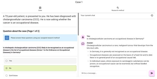 After each case, participants could choose to continue to another case or proceed to the final questions, ensuring that the concluding questions were addressed. The final questionnaire reassessed participants’ occupational medicine expertise, recorded which research tools were used, and gathered feedback on their research experience, including both positive and negative comments.