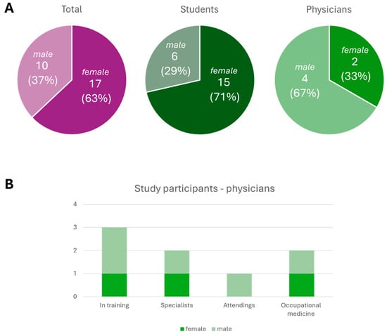 Demography of participants. (A) Percentages of female and male participants in total, among students and physicians. (B) Percentages of female and male participants among physicians in training, specialists, attendings, and occupational medicine physicians.