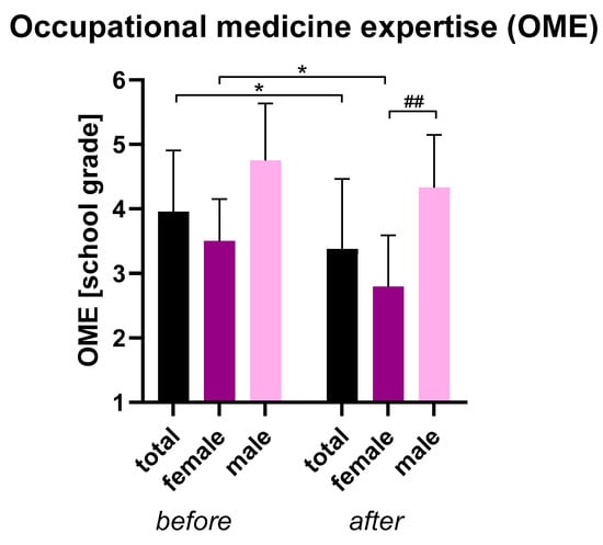 Occupational medicine expertise of participants—comparison between before and after ChatGPT use. Participants rated their self-perceived expertise according to German school grades between 1 (very good) and 6 (unsatisfactory). Mean ± SD, * p < 0.05 for Wilcoxon test for paired samples, ## p < 0.01 for Mann–Whitney U test for unpaired samples.