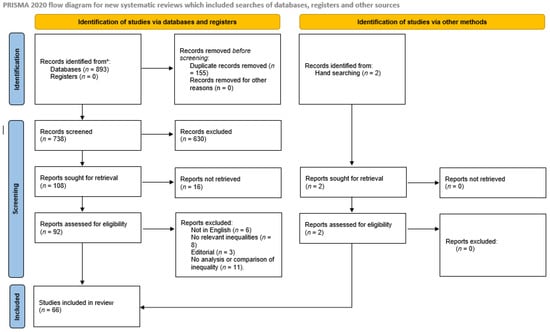 The searches identified 738 unique records with an additional 2 records identified from hand searching (Figure 1). Of these, 674 were not eligible for inclusion in this review. Publications identified were published from 1996 onwards (to 2024). Ineligibility was primarily due to the studies not including geographic or socioeconomic inequalities or inequities. Overall, 66 studies were included in the review. Studies came from 20 countries, with papers from the USA being the most common (n = 23), followed by Spain (n = 4), France (n = 4), Australia (n = 4) and South Korea (n = 4). Two studies took a global perspective.