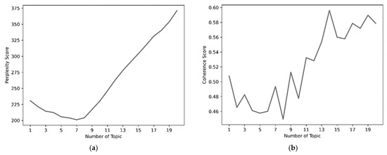 Indicators for topic partitioning. (a) Perplexity—topic number in LDA. (b) Coherence—topic number in LDA.