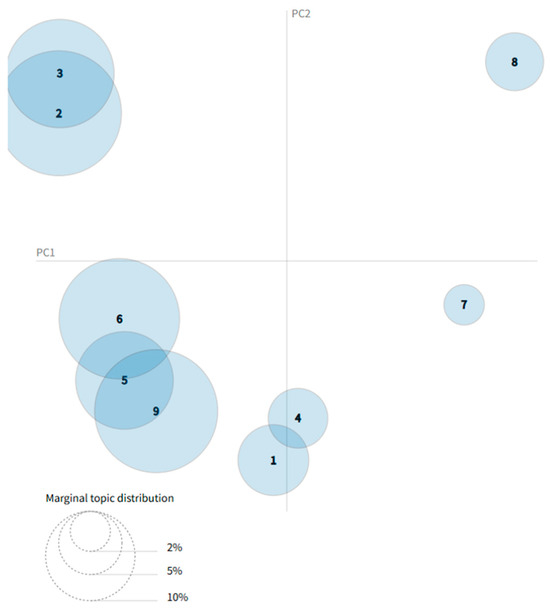 We applied the LDA model for topic extraction [61]. The number of topics in the model was determined based on a comprehensive evaluation of perplexity and coherence metrics. Setting the number of topics to nine resulted in relatively optimal performance in both perplexity and coherence, and thus, nine topics were ultimately selected to capture the multidimensional thematic structure of the texts (see Figure 2). During the training process, the LDA model iteratively inferred the word and topic distributions, continually optimizing its performance. With each iteration, perplexity decreased and coherence improved, allowing the final model to achieve an optimal balance between inter-topic distinctiveness and intra-topic consistency.