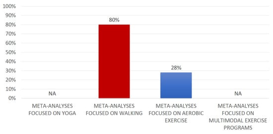 The degree of overlap between meta-analyses of interest was calculated for the following physical activity modalities: walking and aerobic exercises (Supplementary File S6). The degree of overlap between the meta-analyses evaluating both physical activity modalities was very high (walking CCA: 80%; aerobic exercise CCA: 28%). The degree of overlap for all analyses is depicted in Figure 2. We could not calculate the degree of overlap for meta-analyses evaluating yoga or multimodal exercise programs, and the reasons are reported in Supplementary File S6. In addition, no possibilities emerged to calculate the degree of overlap between meta-analyses considering movement in water since only one meta-analysis evaluated this intervention.