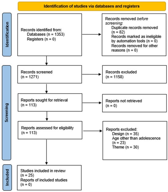 Exclusion criteria included the following: studies that were not original research articles (e.g., conference abstracts, protocols, literature reviews, or meta-analyses); articles that had been retracted (verified through the Retraction Watch database); and studies that did not report data separately for adolescents and young adults when the sample included broader age ranges. Notably, no studies were excluded based on methodological quality or risk of bias at the eligibility stage; these factors were evaluated post-inclusion using the JBI critical appraisal tools [13].