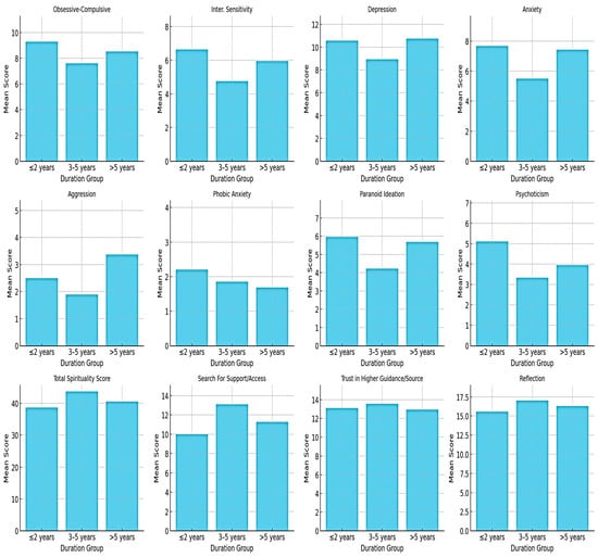p = 0.006), with mothers in the shortest and longest duration groups reporting higher scores than those in the mid-duration group. In contrast, no statistically significant differences were observed for the total spirituality score or for any of the spirituality subscales across the duration groups (all