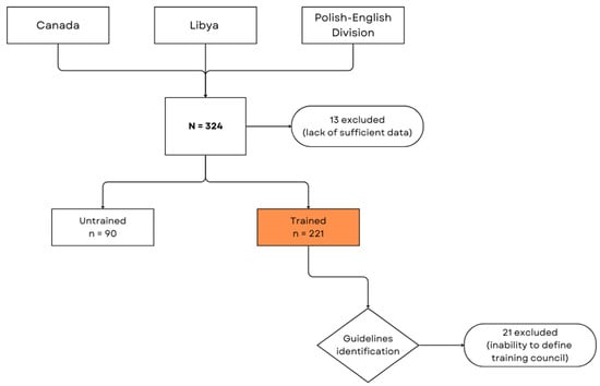 A total of 324 responses were received, and 13 responses were ineligible due to missing data and were discarded. Respondents were assigned to reference groups based on their responses to the question, “Have you received training on how to manage airway obstruction caused by foreign objects in children and infants?”. Respondents, who self-reported no training (n = 90) were assigned to the untrained group and served as the control. Trained respondents were assigned to the guideline identification group (n = 221) according to self-reported data of which the training council’s guidelines they had been taught and were subsequently categorized accordingly. Some respondents (n = 21) were excluded due to their inability to identify their training provider or with which guidelines/standards training was conducted (Figure 1).