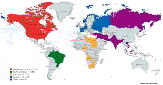 A cohort of 290 medical students were included in the latter analysis. The mean age of the participants was 24.4 ± 3.9 (Me = 24; min = 18; max = 44). The majority of the participants were female (68.2%). A total of 98 (33.8%) respondents attended 9 Canadian universities (CA), 97 (33.4%) attended 2 Libyan universities (LY), and 95 (32.8%) attended 1 Polish university, with admission to programs in English language (PL-Eng). Despite attending medical institutions in only 3 countries, a total of 37 countries were reported by the participants when they were invited to identify their country of origin (Figure 2).