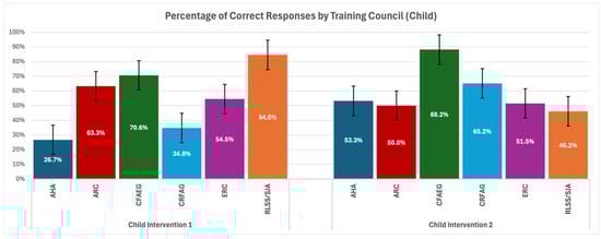 This study reveals substantial variability in knowledge retention across training councils, with RLSS/SJA consistently outperforming others. However, the small sample size in this group makes these findings less generalizable. CFAEG achieved the highest adherence rates on average in most scenarios. This highlights the efficacy of their training approach, likely attributed to detailed, simulation-based curricula that reinforce long-term retention. In contrast, AHA, while globally prominent, showed relatively poor adherence in Child—First Manoeuvre, indicating potential gaps in their teaching methodologies for paediatric choking scenarios. Similarly, ERC displayed moderate but inconsistent results for Infant—Second Manoeuvre. CRFAG performed exceptionally well in infant scenarios yet had lower success rates with first rescue manoeuvres for child choking. This disparity may reflect differences in emphasis during training or the complexity of certain algorithms.