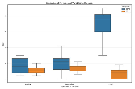 The strong discriminatory performance of the psychological variables model (R2 = 0.50) and its underlying group differences can be examined in more detail through the distribution characteristics of the variables (Figure 1). Box plots showing the distribution of psychological variables (anxiety, depression, CRSIQ scores) between COPD patients and CG are given in Figure 1.