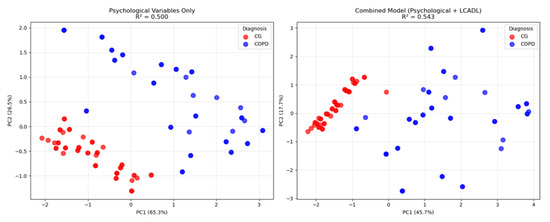 To further validate these statistical findings and visualize the enhanced discriminatory power achieved by combining psychological and LCADL variables, Principal Component Analysis was employed to demonstrate the multivariate separation patterns between groups (Figure 2).