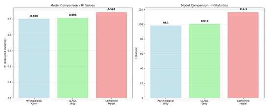 Comparative visualization of PERMANOVA model performance systematically revealed the contributions of different variable combinations to group separation (Figure 3). In the R2 value comparison, the psychological variable model (R2 = 0.50) and LCADL category model (R2 = 0.51) demonstrated similar discriminatory power. However, the combined model achieved the highest performance (R2 = 0.54), demonstrating its synergistic superiority. The F-statistic comparison also supported the same pattern, showing that the combined model had the strongest statistical effect (F = 116.35). This visual analysis concretely demonstrates that a holistic approach to COPD patient assessment provides methodological superiority.