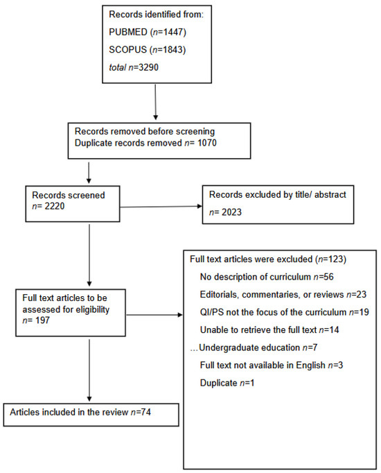 After duplicates were removed, based on the title and the abstract, 2023 were excluded, with 197 full-text articles to be retrieved and assessed for eligibility. Of these, 123 were excluded for the following reasons: 56 had no description of curriculum, 23 were editorials, commentaries, or reviews, 7 referred only to undergraduate training, 19 had other focus than QI/PS, 3 had no full text available in English, and 1 was duplicate—presenting the same intervention/setting in an article with a different title. We excluded 14 articles because we were unable to retrieve them. The remaining 74 articles were considered eligible for this review. The procedure is presented in the PRISMA ScR flow diagram (Figure 1).