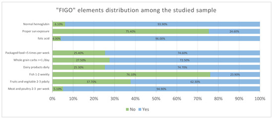 The distribution of all FIGO checklist elements is shown in Table 2 and Figure 1. Sufficient folic acid intake, normal hemoglobin level and appropriate intake of meat and poultry were reported among a significant majority of the studied sample (96.0%, 93.9% and 94.9%, respectively), reflecting a good adherence to antenatal care along with good protein intake among the studied sample. Meanwhile, there is a large proportion of participating women reporting adequate whole grain intake (72.5%), satisfactory dairy product intake (74.7%), careful intake of packaged food (74.6%) and only 62.3% reported adequate intake of fruits and vegetables. On the other hand, some concerning figures are found among the studied sample, such as the low prevalence of proper sun exposure (24.6%) and insufficient fish intake (23.9%), which identify some areas for potential improvements and interventions among the Saudi population. The median NRS score was 6 and the IQR was 5–7 and the majority showed low nutritional risk scores (89.1%).