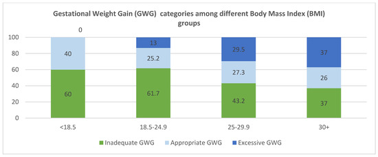 Percentage of gestational weight gain (GWG) according to IOM among various pre-pregnancy Body Mass Index (BMI) groups.