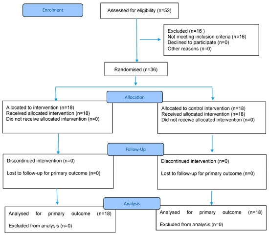 Before starting the study, a power analysis was performed using the G*Power 3.1.9.4 program with α = 0.05 and Power (1 − β) = 0.80. The outcome measure was the percentage change in the two groups based on the initial measurement of the PBBS test, which was one of our primary outcomes. Using the obtained results (means and standard deviations) from this study, we calculated the effect size as 1.04 and a total sample size of 32 (n1 = 16, n2 = 16). Anticipating potential data loss, the study was conducted with 36 participants (n1 = 18, n2 = 18).