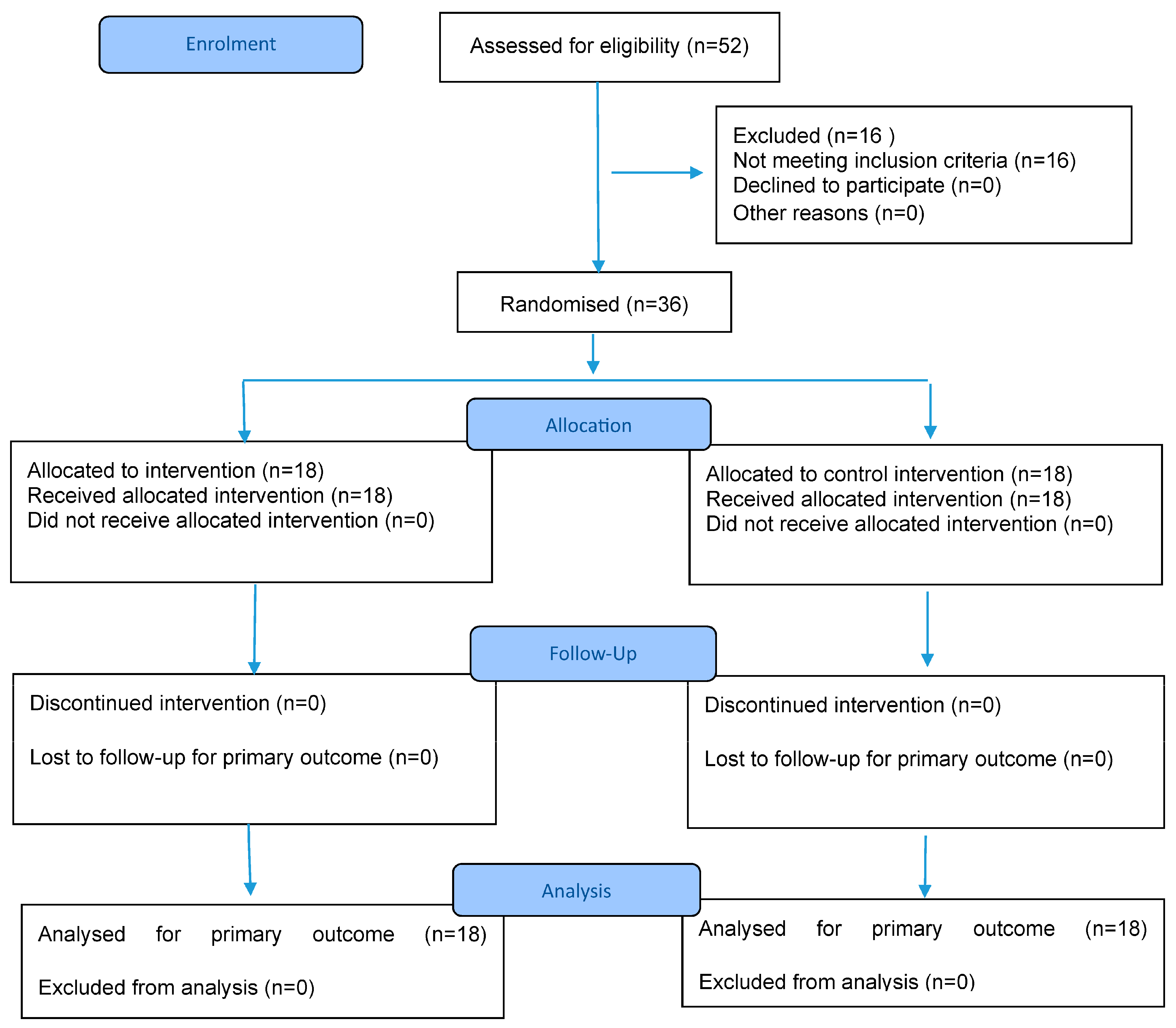 Participants were randomized to either the control or study group via computerized simple randomization using the RAND () function in Microsoft Excel, which generated a sequence of ‘1’ (study) or ‘2’ (control) codes. To ensure allocation concealment, the codes were placed in sequentially numbered, light-proof, opaque envelopes, each labeled with a participant number and group allocation. The envelopes were sealed and prepared by an independent research coordinator uninvolved in recruitment or assessment. After enrollment, participants randomly selected the next consecutively numbered envelope (rather than drawing from a pool) to maintain sequence concealment. The administering physiotherapist opened the envelope to reveal the assignment, while assessors (therapists) and the statistician remained blinded (single-blind design). Envelope integrity was monitored throughout the trial, and the allocation sequence was inaccessible to study personnel until intervention assignment. Outcome assessors and data analysts were blinded to group allocation. Participant and intervention provider blinding was not feasible due to the nature of the exercise therapies. Blinding was attained by (1) using different intervention and assessment personnel, (2) evaluation standardization protocols, and (3) coded datasets. Envelope integrity and allocation concealment were both maintained during the trial.