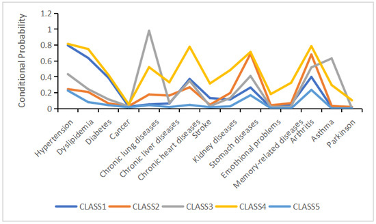 In the cardio-metabolic class, the prevalence of hypertension and dyslipidemia was 86.8% and 70.4%, respectively. The digestive–joint class exhibited high prevalence of gastric diseases (86.5%) and arthritis (78.2%). The respiratory class had a 100% prevalence of lung diseases, with asthma affecting 79.4% of this subgroup. In the cardiovascular–digestive class, the prevalence of hypertension, heart disease, and gastric diseases were 83.9%, 82.5%, and 76.1%, respectively. Participants without chronic comorbidities and those at low risk of comorbidity were classified into the relatively healthy class.