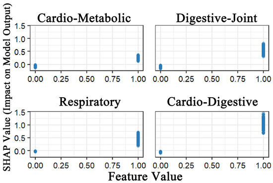 To address the black-box nature of machine learning models, SHAP was applied to interpret the XGBoost model. Figure 2 demonstrated that all four multimorbidity patterns exhibited positive predictive effects on depression. Among these, the Class 4 multimorbidity pattern (cardiovascular–digestive cluster) exerted the strongest predictive effect, followed by Class 2 (digestive–joint cluster). While Class 1 (cardio-metabolic cluster) and Class 3 (respiratory cluster) also showed predictive utility, although their effects were relatively weaker. This finding demonstrates strong consistency with the results from the logistic regression analysis.