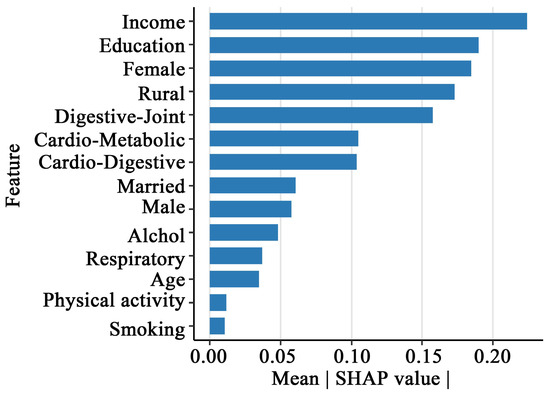 Figure 3 illustrates the global feature importance for depression prediction. Results revealed that all four multimorbidity patterns served as significant predictors of depression. Notably, Class 2 demonstrated the highest mean SHAP value, indicating its broad and statistically substantial influence across the model. Class 1 and Class 4 exhibited comparable mean SHAP values, and Class 3 displayed the least influential contribution. The model also identified key sociodemographic predictors, with income level, educational attainment, gender, and residence emerging as the most critical determinants of depression risk.