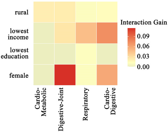 Interaction analysis (Gain > 0.01) revealed significant synergistic effects between the four multimorbidity patterns and multiple sociodemographic variables (Figure 4). Among these, the interaction between the Class 2 pattern (digestive–joint cluster) and female sex exhibited the most substantial contribution to model predictions (Gain = 0.115). The Class 4 pattern (cardiovascular–digestive cluster) demonstrated particularly complex interaction effects, with significant synergies observed for lowest-income levels (Gain = 0.072) and female sex (Gain = 0.059). Notably, lowest income and rural residency both showed significant interactions with most multimorbidity patterns.